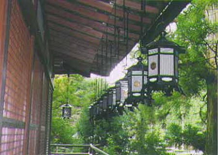 独特の形をした提灯が周りを飾る。本殿にあるのはほとんどが黒色で中には金色のも